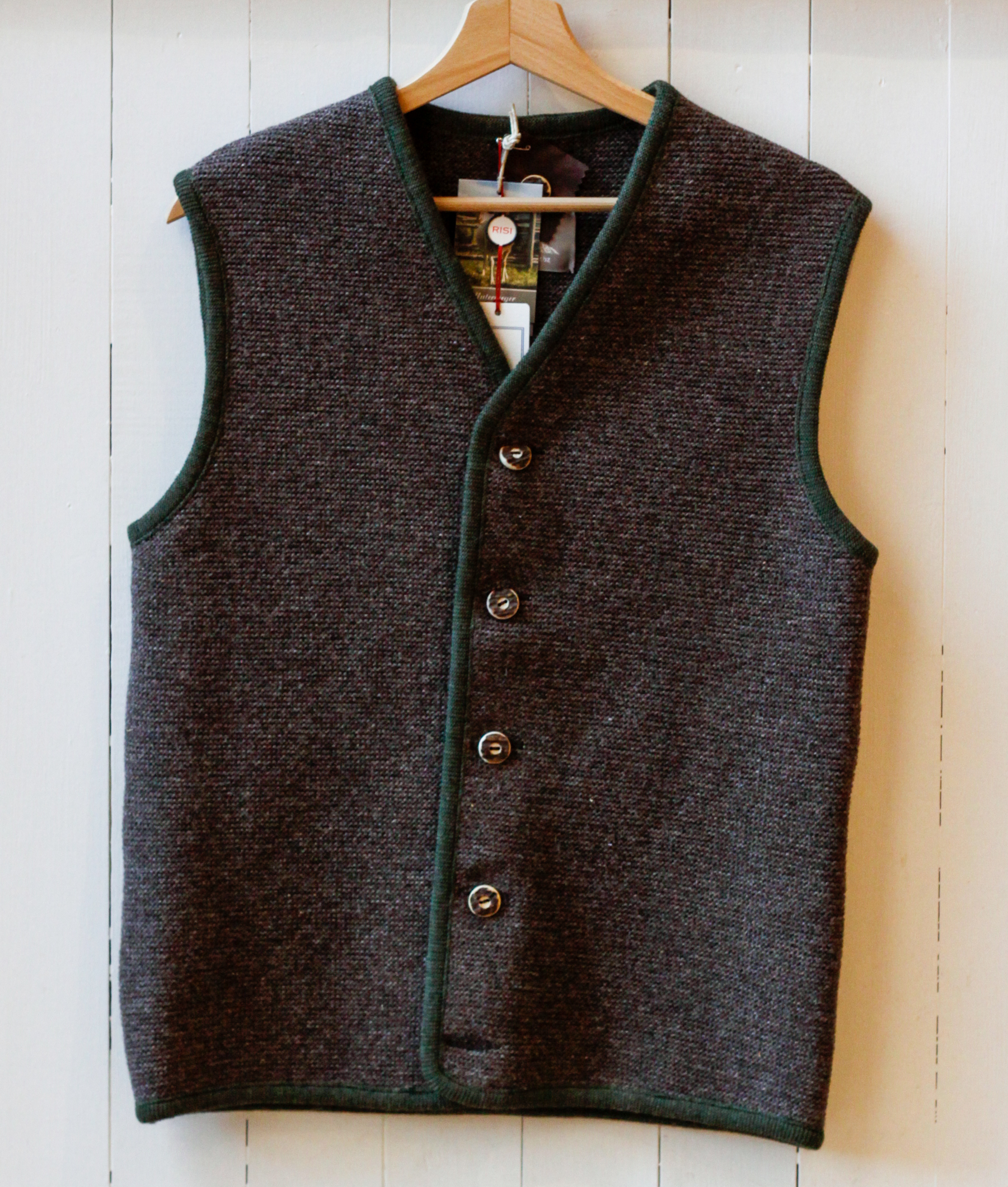 Alberico è il gilet da uomo in lana cotta  lavorato con tecnica tradizionale Sarner, caldo, resistente e traspirante. Caratterizzato da bottoni in vero osso, unisce eleganza alpina e robustezza artigianale. Perfetto per chi cerca stile senza tempo, qualità naturale e comfort in ogni occasione.