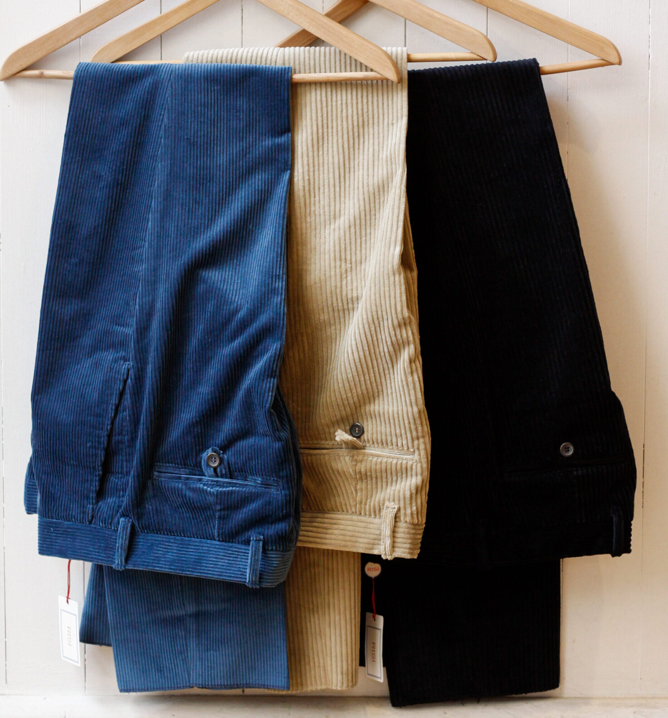 • velluto a coste larghe blu scuro, sabbia chiaro, verde army e avorio