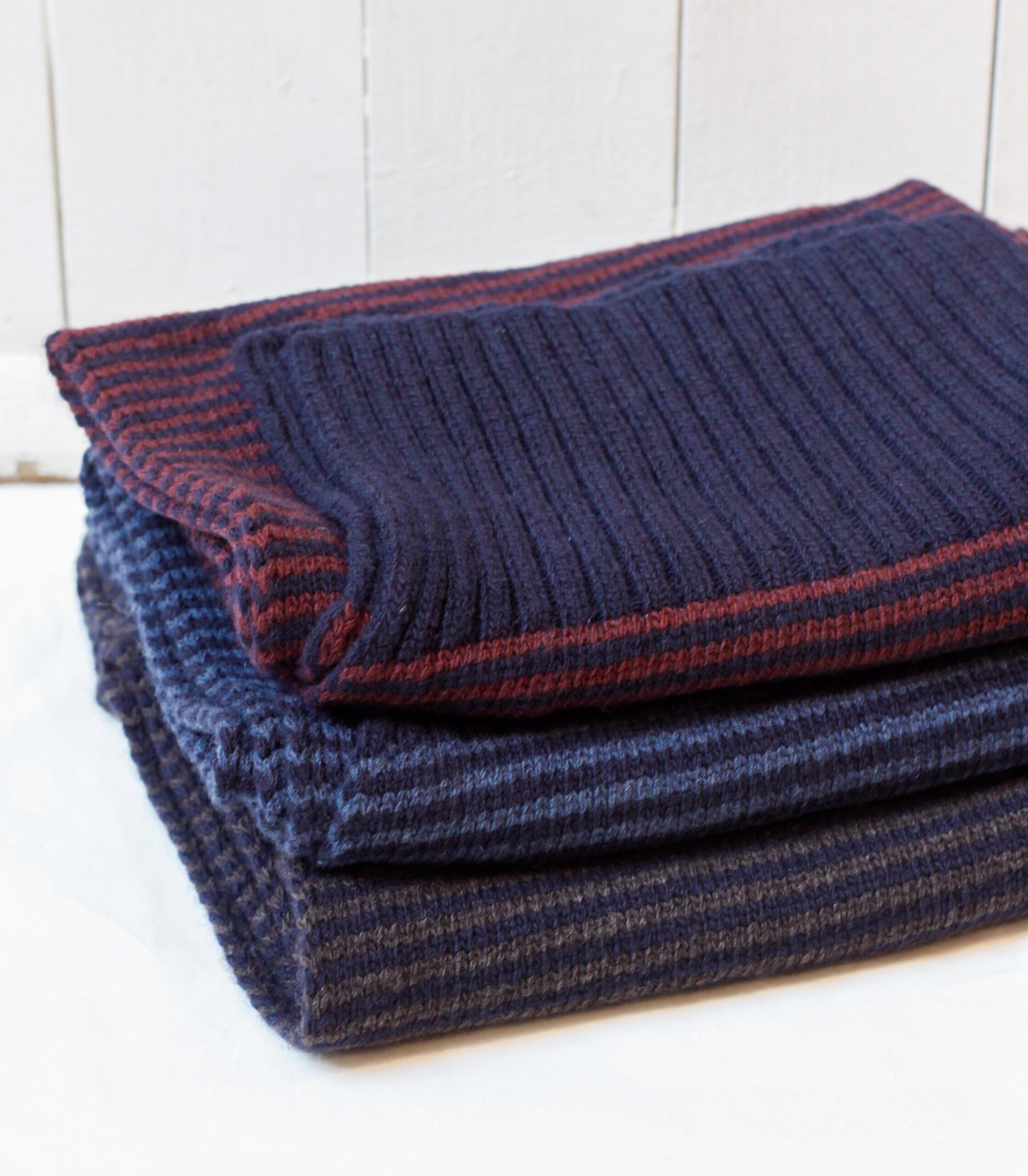 • lana e cashmere a righe blu e bordeaux, blu e testa di moro, blu e marine.
