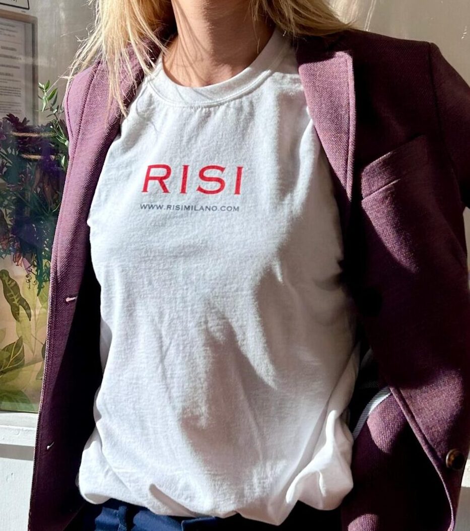 Alessandra è la t-shirt con serigrafia RISI Milano sul petto: semplice, iconica, e con il nostro marchio sempre al tuo fianco.